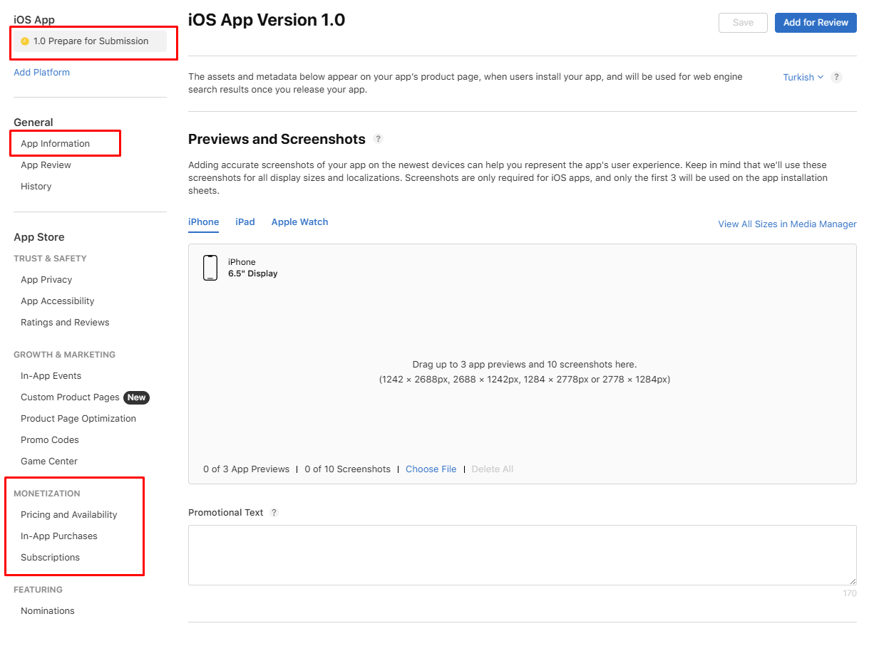 bir ekran görüntüsü almak istedim ama review’den geçtikten sonra bu kısım kapanmış bende. Ama oluşturduğunuz tüm in-app purchases ve subscription maddelerini ya IOS App başlığı altındaki 1.0 Prepare for Submission ya da App Information kısmında bulabilirsiniz. Ama bunların ekstra olarak Monet,zation bölümünden oluşturulduktan sonra bir yerde seçilmesi gerekiyor.